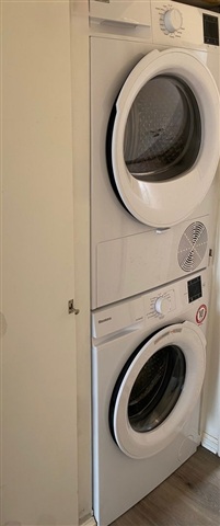 The kitchen, designed in a timeless white color scheme, offers plentiful cabinet and countertop space along with integrated appliances. It also includes both a dishwasher and a washing machine, and there is enough room for a small dining table. The bathroom is modern and well-maintained, featuring large, light-colored tiles, a wall-mounted toilet, and a separate shower niche.