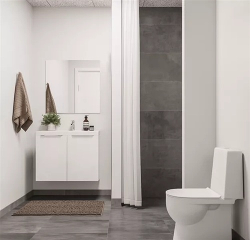 The bathroom is finished with modern materials and includes a shower enclosure, toilet, and washbasin, with storage conveniently located beneath the sink.