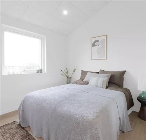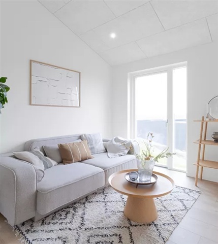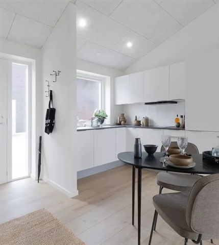 The property features a practical and open-plan kitchen and living area, where the kitchen is situated along one wall, seamlessly blending into the living space. Equipped with a contemporary HTH kitchen including built-in appliances, it provides an excellent environment for cooking and daily activities. The layout offers ample room for both a dining table and a seating area, and the living room has direct access to the terrace.Within the residence, there is one bedroom spacious enough to accommodate a double bed and a wardrobe solution. Larger floor plans include additional rooms, which can be utilized as children's bedrooms, a home office, or guest rooms depending on needs.