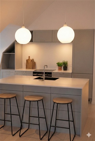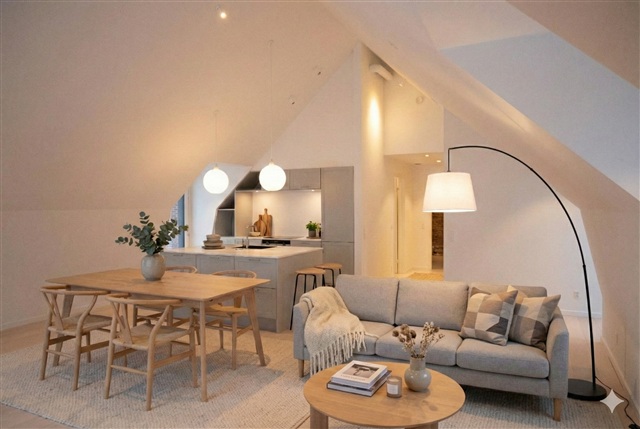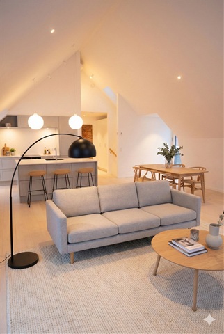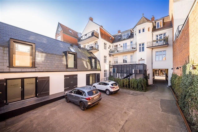 Situated on the desirable Slotsgade, this inviting apartment offers a unique location overlooking the charming Slotssø and is nestled in the very center of Hillerød. Here, you enjoy the vibrant city atmosphere just outside your front door, while having natural surroundings as your closest neighbor.The property encompasses 112 well-utilized square meters and presents itself as bright, contemporary, and ready for immediate move-in. At the heart of the home lies a spacious kitchen and dining area, where vaulted ceilings and skylights provide an impressive sense of space and abundant natural light. The kitchen features a sleek and practical design with ample cabinetry, generous countertop surfaces, and an island that invites both everyday cooking and cozy dinners with friends.