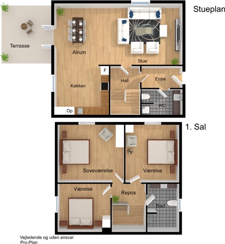 Upstairs, a hallway provides access to the master bedroom, a bathroom, and two children's bedrooms. Each of these rooms is equipped with built-in wardrobes featuring white cabinetry.
