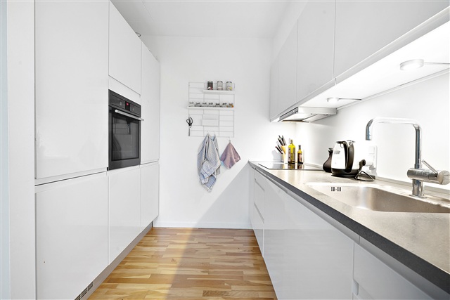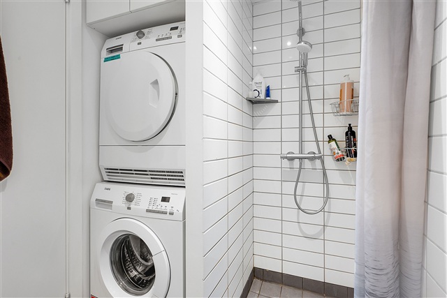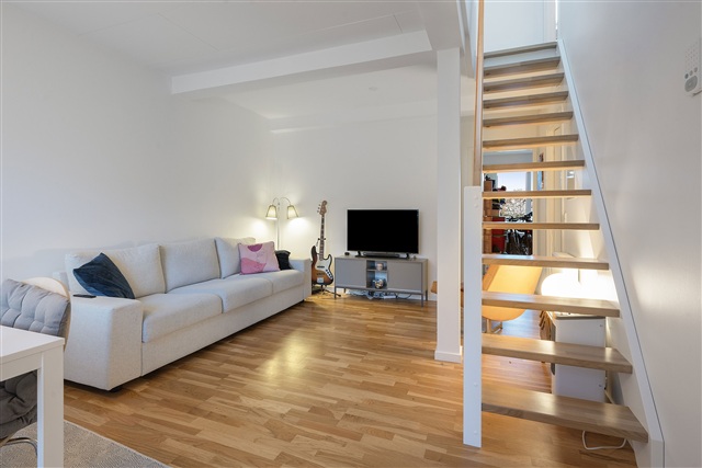 The apartment features an open-concept kitchen and living area with a staircase connecting the ground floor to the first floor. The kitchen is fitted with white HTH cabinetry and includes AEG appliances such as a dishwasher, a fridge-freezer combination, a noise-reducing extractor hood, an oven, and an induction cooktop. The bedroom offers integrated closet space, while the bathroom is equipped with underfloor heating and a stacked washer-dryer unit. The building provides an elevator, free parking, covered bicycle storage, a storage room, and is situated within a short distance of shopping facilities and transportation options.