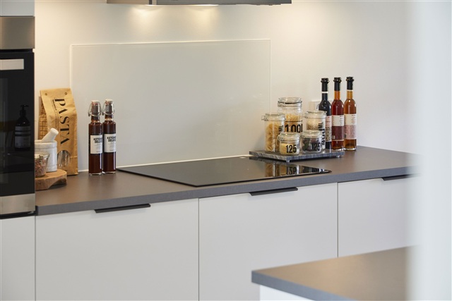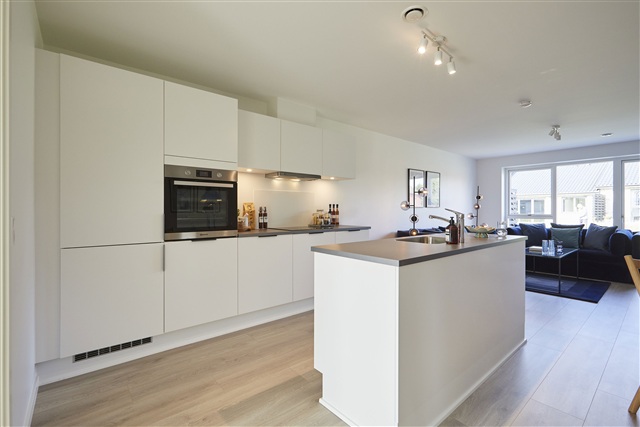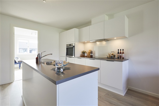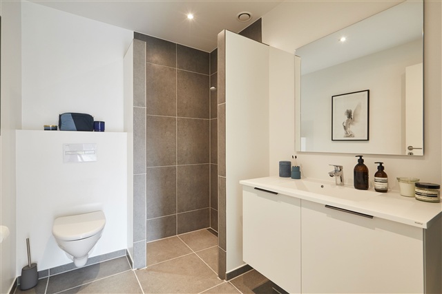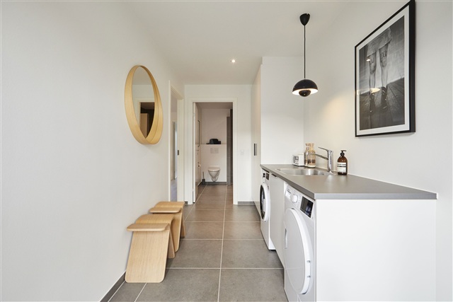 Throughout the residence, fine details can be found, including the utility room equipped with a worktop and sink. The bathroom, positioned off the utility room, along with the kitchen, utility space, and bedroom, feature modern cabinetry in a sleek white finish with anthracite-gray linear handles. Practical laminate countertops in a "rustic slate" color provide durable surfaces, paired with generously sized stainless-steel sinks. A splashback behind the cooking area simplifies cleaning. The bathroom sink is made from molded material, and the toilet is a wall-mounted model from Ifö Sign. Quality fixtures from German brand Hans Grohe are used, and the shower area includes a linear drain.