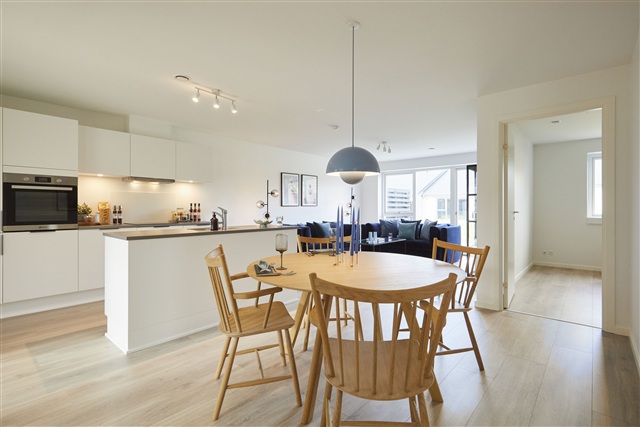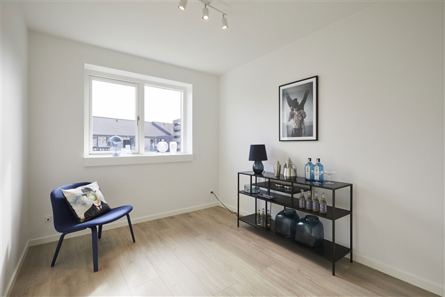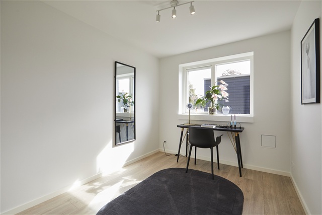 This modern townhouse is designed to make full use of every square meter. Upon entering, you step into a separate entrance hall that provides access to an additional room. From this hallway, the layout opens into a combined kitchen and living area, featuring a contemporary kitchen seamlessly connected to a spacious living room, offering ample space for a cozy seating arrangement. Adjacent to the living area is a utility room equipped with a sink as well as a washing machine and dryer. Beyond the utility space lies a large, modern bathroom. The residence also includes a spacious bedroom fitted with a built-in wardrobe wall. From the living room, there is direct access to a backyard terrace and a pleasant garden.Outdoors, the property boasts its own garden and terrace, complemented by a 7 m² storage shed for tools and equipment. Parking is available with two spaces located conveniently close to the home. All utility consumption-electricity, heating, water, and wastewater-is settled directly with the respective service providers. The homes themselves are characterized by bright, airy interiors with smooth white ceilings and walls, enhancing the sense of openness. Large, operable windows allow abundant natural light throughout. The main living spaces, which include the kitchen, dining area, and living room, feature expansive window sections on multiple sides to maximize daylight exposure. Flooring consists of oak plank laminate in the kitchen, dining, living room, and bedrooms, while the entrance, utility room, bathroom, and shower have light gray tile floors. All interior doors are smooth and white with stainless steel handles and are installed without thresholds to facilitate easy passage. Brick window sills and white, water-sprayed surfaces complement the finishes, with walls meeting the floors at clean, white skirting boards.