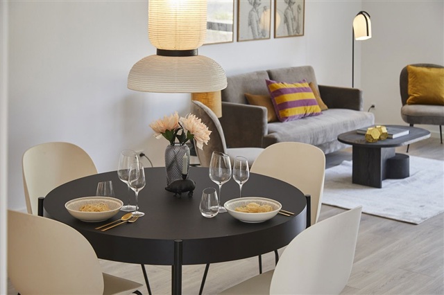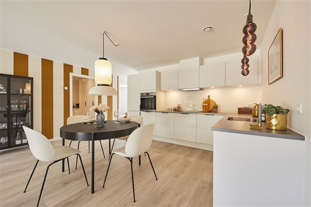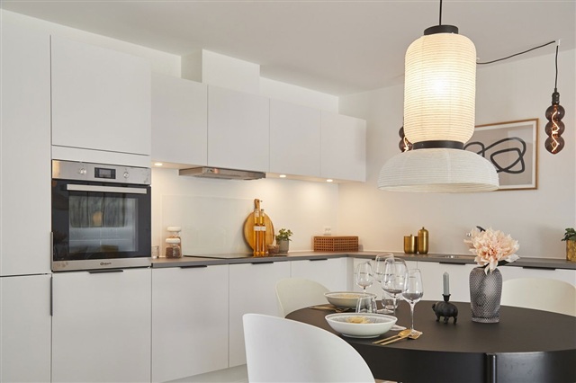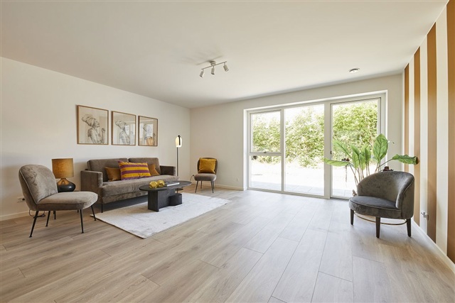 The homes are designed to be open and luminous, showcasing white, smooth ceilings and walls. The large, operable windows are positioned to enhance natural light throughout. The living spaces-comprising kitchen, dining, and lounge areas-feature expansive window sections on multiple sides, maximizing daylight. Oak plank laminate flooring extends across the kitchen, dining, living rooms, and bedrooms, while the entrance, utility room, bathroom, and shower areas are finished with elegant light grey tile floors. Doors throughout the property are smooth white with stainless steel handles and threshold-free, optimizing accessibility. Window sills are brick-built and painted white with water-resistant plaster. The walls meet the floors with smooth, white skirting boards.