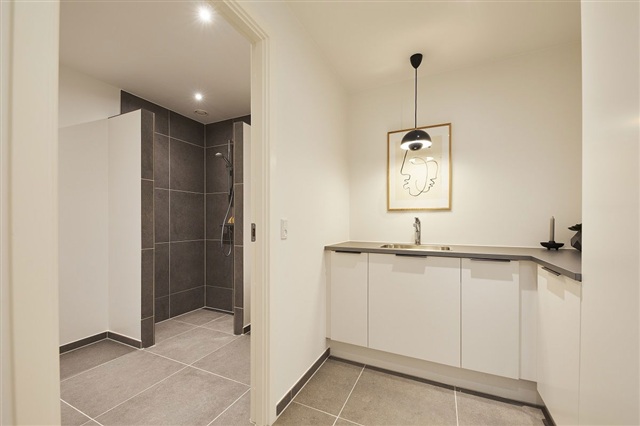 Thoughtful details are evident throughout; every home includes a utility room complete with a countertop and sink. The bathroom, connected to the utility room, along with the kitchen and main bedroom, features modern cabinets with a smooth white finish and anthracite-colored linear handles. Practical laminate countertops in 'rustic slate' shade house spacious stainless steel sinks. A splashback behind the stove facilitates easy cleaning. The bathroom sink is made from molded material, complemented by a wall-mounted Ifö Sign toilet, high-quality Hans Grohe fixtures from Germany, and a linear drain in the shower niche.