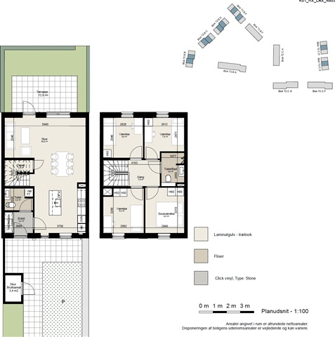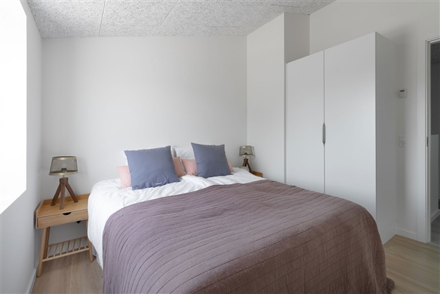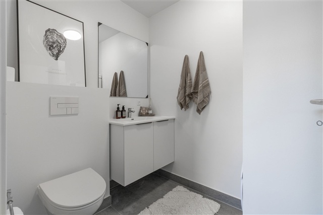The finishing materials are selected for a modern yet simple aesthetic, featuring white HTH cabinetry, durable oak laminate floors with underfloor heating in every room, and a full complement of built-in appliances including a washing machine and dryer. The house is environmentally conscious, equipped with triple-glazed windows and a ventilation system that promotes a healthy indoor climate. One pet is allowed by arrangement. Please note that all images and floor plans are indicative only.