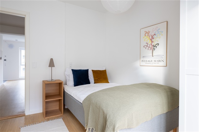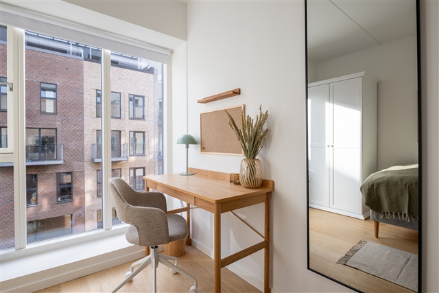 This duplex apartment, constructed recently, features a private rooftop terrace measuring 35 square meters. The interior is distinguished by elegant wooden flooring and expansive double-glazed windows that bring in ample light. The home is equipped with central heating, and every room benefits from underfloor heating controlled individually via digital thermostats. The layout on the first floor includes a contemporary dining kitchen open to a TV lounge area, a guest toilet, one bedroom, and a storage space. The second floor offers a hallway, a spacious bathroom, three additional bedrooms, and access to the rooftop terrace via stairs.The bedroom comes furnished with a high-quality bed complete with bedspread, duvet, and pillows. Next to the bed, there is a bedside table paired with a reading lamp. A desk setup includes a chair and a desk lamp. Storage is provided through a wardrobe that has both drawers and hanging sections, along with storage boxes positioned under the bed. Additional items such as curtains, a mirror, a laundry basket, a trash can, rugs, and various decorations are included, although not all are shown in the photographs.