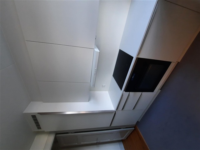 The kitchen is pristine and well-maintained, featuring white cabinetry equipped with integrated appliances including a fridge/freezer, built-in stovetop, oven, extractor hood, and dishwasher. The countertop is white with a recessed black sink and fitting, combining functionality with a clean design.
