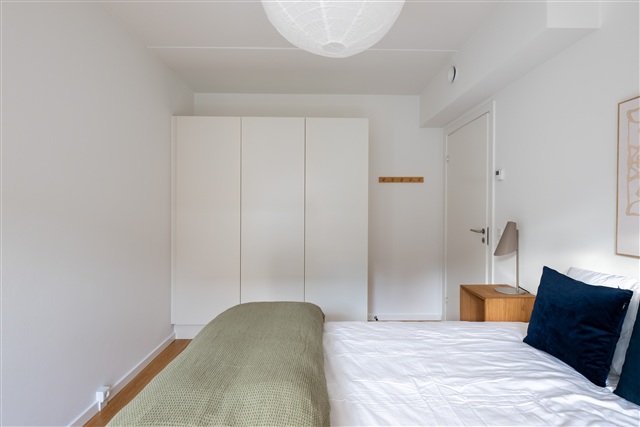 The sleeping area comprises a high-quality bed accompanied by bedspread, duvet, and pillows. Additional furnishings include a bedside table with a reading lamp, a desk furnished with a chair and desk lamp, and a wardrobe providing both drawers and hanging options. Underneath the bed, storage boxes are available. The apartment is also furnished with curtains, a mirror, a laundry basket, a trash bin, rugs, and various decorative items, though not all these are depicted in the photographs.