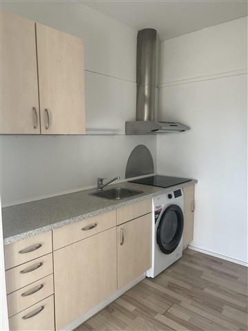 This recently renovated and updated two-room apartment features an entrance area leading into a spacious, bright living room with large windows that allow plenty of natural light. The kitchen is brand new, equipped with Kvik cabinetry and includes all necessary appliances such as a fridge-freezer combination, a built-in oven, ceramic cooktops, and a dishwasher.The unit comprises a bathroom and one bedroom. Additionally, the apartment comes with a basement storage space.