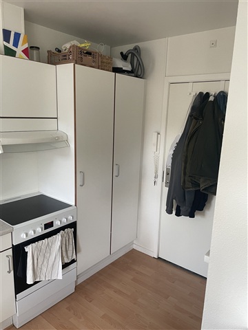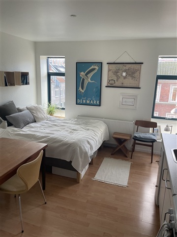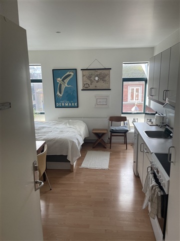 A studio apartment located on H. N. Clausens Gade in the center of Aarhus is available for rent.This cozy unit spans 28.6 square meters and is situated in a prime area of the city. Inside, the apartment features a bright living space combined with a kitchen area. There is a private bathroom with a separate shower cubicle. The walls throughout the apartment are painted white, complementing the kitchen, which also has white cabinetry. The kitchen is equipped with a sink, a fridge/freezer, a stove with an extractor fan, and ample storage space in the cupboards.