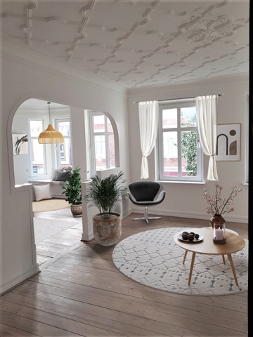Situated right in the heart of Silkeborg, this apartment boasts an exceptional central location. It features a range of distinctive details that contribute to its unique character and charm. Upon entering, you are welcomed into a spacious hallway providing ample room for coats and boots.The living area stands out with its own distinct atmosphere, showcasing beautiful rustic plank flooring, high ceilings adorned with stucco and decorative moldings, and an elegant archway separating the two lounge spaces. There is also a premium sofa positioned to take advantage of the city views. The apartment includes one bedroom with direct access to the bathroom, which remains in excellent original condition and is equipped with a bathtub.
