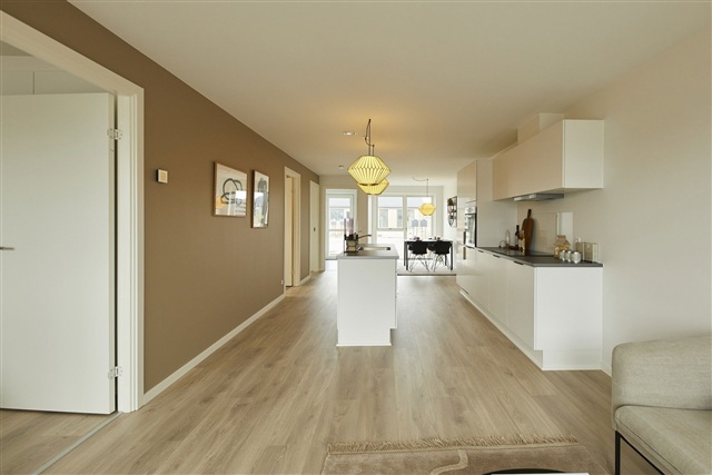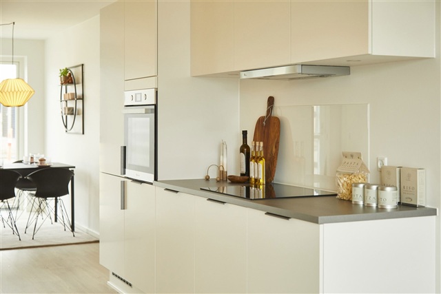 Located in Give's Pigernes Kvarter, this inviting semi-detached house spans 85 square meters and offers a harmonious blend of natural light, practicality, and tranquil materials. Upon entering, you step into a separate hallway that leads into the home's central living area-an open kitchen combined with the dining and living room. Expansive windows flood the room with light, creating a welcoming atmosphere, and there is ample space for a dining table as well as a cozy seating area. From the living room, you have direct access to a terrace that runs the entire width of the house, extending further into the private garden.The kitchen features sleek HTH cabinetry and comes fully equipped with major appliances, including a built-in oven housed in a tall cabinet, a dishwasher, and a refrigerator/freezer. The residence includes a spacious master bedroom fitted with built-in wardrobes and an additional room that can be adapted for various needs. The utility room is outfitted with a sink, storage space, as well as a washing machine and tumble dryer. The bathroom is modern and includes a wall-hung toilet, a shower enclosure, and high-quality fixtures. Throughout the house, underfloor heating is installed with individual thermostats, complemented by a ventilation system that maintains a comfortable indoor climate throughout the year. Heating is supplied via district heating.