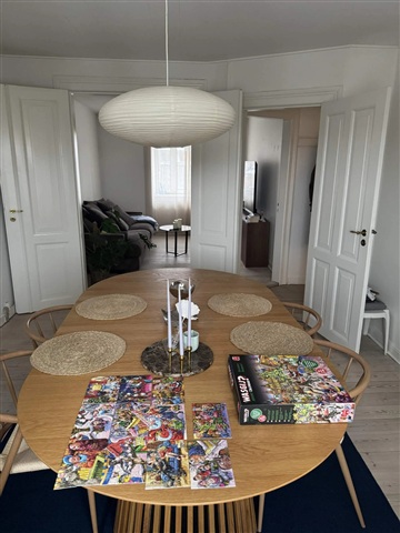 If you are seeking a spacious home with elegant rooms, situated in a location that offers easy access to urban life, nature, and convenient transportation, this well-designed apartment in the heart of Kolding is worth your attention. Spanning 108 square meters, the residence features a bright and welcoming ambience alongside a layout that accommodates both everyday living and cozy moments.The apartment includes a generously sized kitchen, a large bathroom, and a pleasant bedroom with direct access to a small balcony. Additionally, there is an extra room perfectly suited for use as an office, walk-in closet, or hobby space. Two charming living rooms are connected by French doors, providing both a sense of cohesion and versatility. The property also benefits from a nice communal garden, a shared laundry cellar, and a private storage room located in a shed, all facilitating practical daily living.