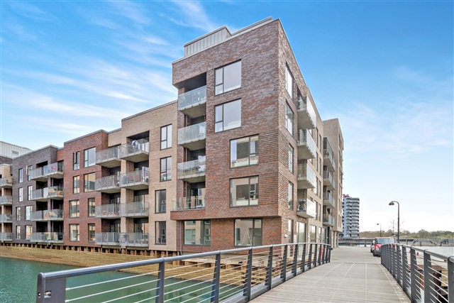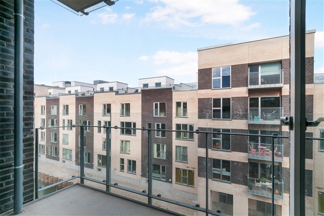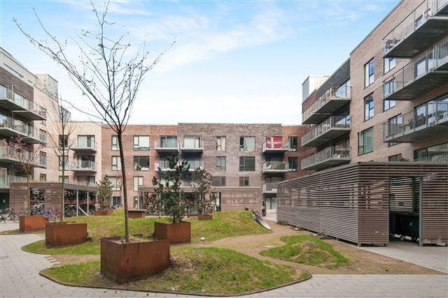 The residence features bright and spacious interiors, centered around an open-plan living area that combines the kitchen, dining space, and living room. This main room benefits from large windows and provides access to a balcony. Carefully selected materials emphasize a light aesthetic and high quality, including solid oak floors from Junckers, kitchens by Unoform, and Siemens appliances.The homeowners' association manages a distinctive common facility situated directly by the southern harborfront. This communal space is designed with a large kitchen, making it an ideal setting for residents to gather for various social events such as cooking sessions, traditional festivities, and other communal activities. Additionally, the room could be equipped with multiple workstations to serve as a shared home office environment, allowing residents to interact while children play safely in a designated area.