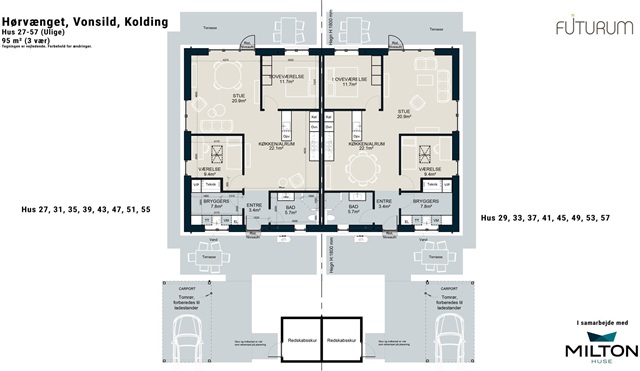Located on Hørvænget in Vonsild, this well-designed semi-detached house spans 95 square meters, blending practicality with comfort. The outdoor spaces are thoughtfully integrated to function as an extension of the living area. Inside, the home presents a bright and welcoming environment where the kitchen and living room flow seamlessly into each other, providing ample room for both dining and lounging. Large windows invite plenty of natural light, establishing a strong connection to the terrace and garden outside.The residence includes a bedroom equipped with three built-in closets and an additional room that can be adapted to suit various needs, such as a home office, children's bedroom, or hobby space. The utility room serves as a functional entry point, featuring laundry facilities and storage, with hookups prepared for both a washing machine and dryer. The bathroom is finished in a clean and modern style, furnished with a shower enclosure and a wall-mounted toilet. Throughout the living areas and bedrooms, light Nordic tones prevail, complemented by oak plank laminate flooring, while dark tiles are used in the entrance, utility room, and bathroom. The entire home benefits from underfloor heating as well as a ventilation system that maintains a comfortable indoor climate all year long. Heating is provided by a heat pump.