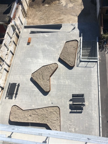Residents have access to a large courtyard featuring cozy corners and a lawn, perfect for enjoying the summer months.