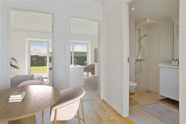 Søhusene is situated in Tilst, surrounded by verdant open spaces with mature trees and a small lake nearby. Convenience is a key feature, with shopping facilities close at hand, the E45 motorway less than 5 kilometers away, and easy access to public transport and the super cycle path right outside the door, providing swift routes into the city.