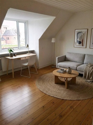 This bright and well-laid-out two-room apartment spans 51 square meters and features continuous wooden floors, white-painted walls, and generously sized windows that contribute to a pleasant living environment. From the balcony, you can enjoy an unobstructed view of the city's rooftops, providing an ideal spot for a quiet outdoor coffee break.The kitchen is designed with a simple and contemporary approach, outfitted with white cabinetry, a black countertop, and ample storage space. Large windows ensure abundant natural light, while built-in appliances such as an oven, stovetop, and dishwasher are integrated seamlessly. The living room offers flexibility in furnishing, accommodating both a sofa and either a dining area or a home office setup. The room's charming slanted walls combined with warm plank flooring add character and make it easy to create a cozy atmosphere.