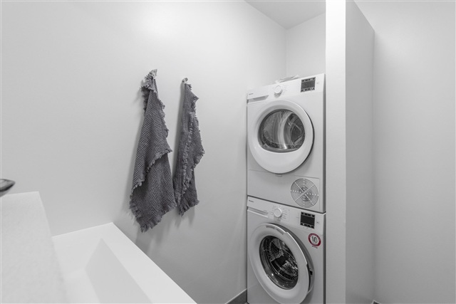 This contemporary two-story townhouse offers a thoughtful layout that clearly separates private sleeping quarters from shared living spaces. Upon entering, you are greeted by a functional hallway featuring storage options and access to a guest toilet. Moving further inside, the bright kitchen-dining area flows seamlessly into the living room, providing ample space for both a dining table and seating area. The kitchen is outfitted with white HTH cabinets and includes all major appliances. A large glass door connects the interior directly to the terrace and the surrounding green outdoor space.Upstairs, the private sleeping area comprises a spacious master bedroom equipped with plenty of closet space, an additional well-sized bedroom, and a modern, light-filled bathroom complete with a stacked washer and dryer. The generous landing area links the rooms together and naturally divides the floor plan.