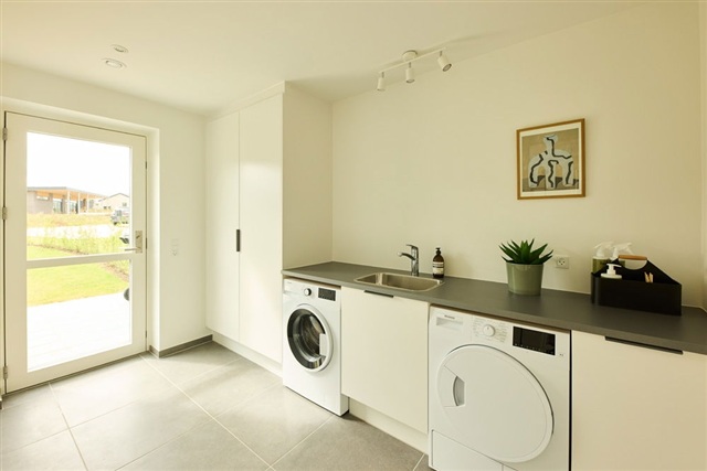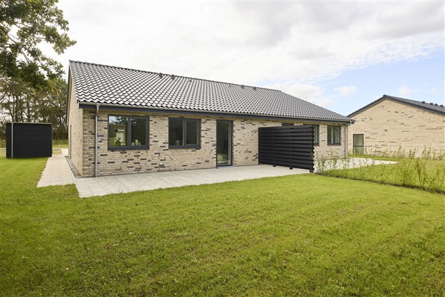The interior color scheme follows a light, Nordic palette, with oak plank laminate flooring in the living areas and bedrooms, while tiles cover the entrance, utility area, and bathroom. The entire house benefits from underfloor heating and a ventilation system ensuring a comfortable indoor climate throughout the year. Outside, the property features a terrace spanning the full width of the house and a manageable private garden. Furthermore, there is a storage shed measuring approximately 7 square meters and two parking spaces adjacent to the home. The infrastructure is prepared for the installation of an electric vehicle charging station.