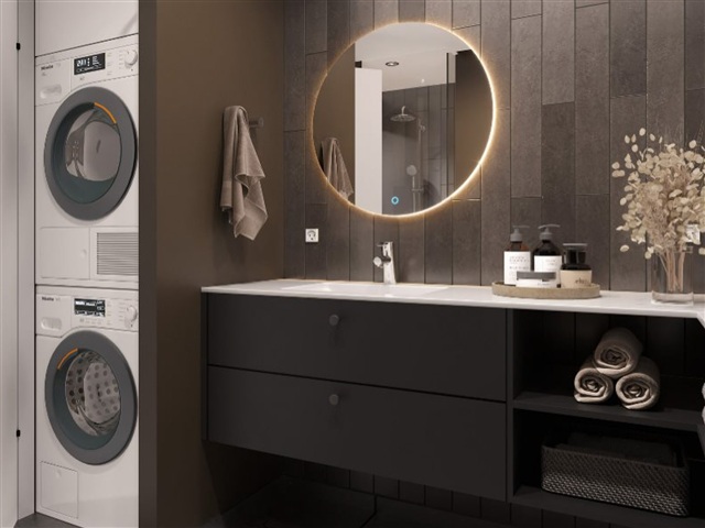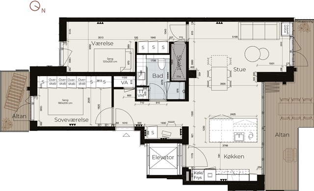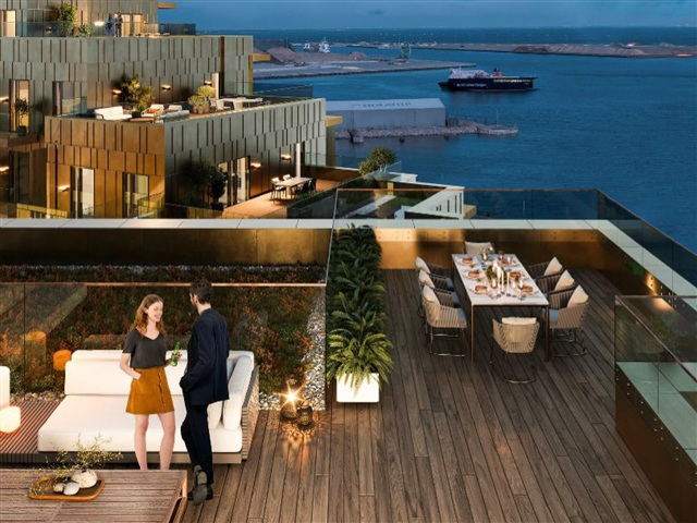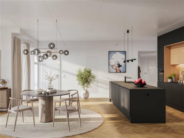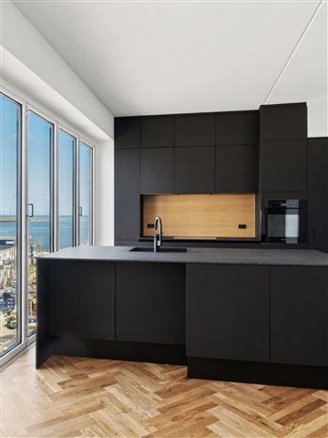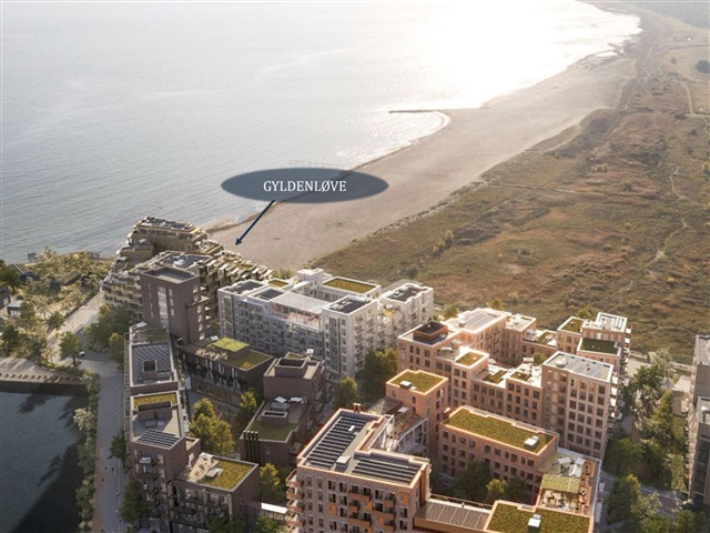 This exceptional apartment in Gyldenløve offers the unique opportunity to be its very first resident. Situated in a picturesque setting right by the sea and adjacent to a protected beach, the location is arguably the finest in Køge's new waterfront district. The residence boasts high-quality features throughout, including herringbone parquet flooring, ample built-in storage, expansive balconies, an elevator that provides direct access to the unit, and solar panels installed on the roof. It is available for immediate rental, with a lease duration of 2 to 4 years.Inside, the layout presents an entryway spacious enough for outerwear and a cozy office nook. The master bedroom includes integrated wardrobes and opens onto a charming balcony. The bathroom is generously sized and equipped with a shower and laundry facilities. Serving as the home's centerpiece, the open-plan kitchen and living area face south and offer stunning water views through large windows. From here, you step out onto a balcony of approximately 15 square meters, which enjoys sunlight for the entire day, perfect for savoring those last moments of an evening drink. There is also a second well-sized bedroom with built-in closets. In addition, the tenant has access to a basement storage room.