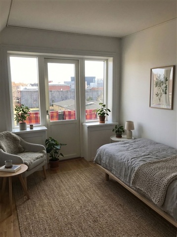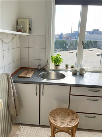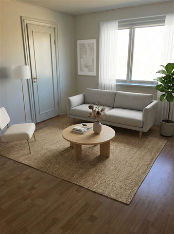 This bright and welcoming apartment spans 88 square meters and offers a practical layout well-suited for couples, small families, or shared living arrangements. The residence features large windows that allow natural light to flood the spaces, complemented by light-painted walls and continuous wooden flooring throughout the living areas, together creating a warm and inviting atmosphere that lends itself effortlessly to a calm, Nordic-inspired interior style.Upon entering, you are greeted by a comfortable hallway with sufficient space for coats and shoes, which leads directly to the home's central living room. This generously sized area accommodates both a sitting and dining section comfortably. The separate kitchen is well-maintained and thoughtfully designed, featuring white cabinetry, ample countertop and storage space, and a large window offering views over the city's rooftops, bringing in natural light that enhances the cooking experience.