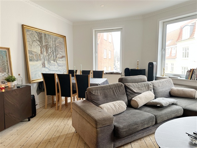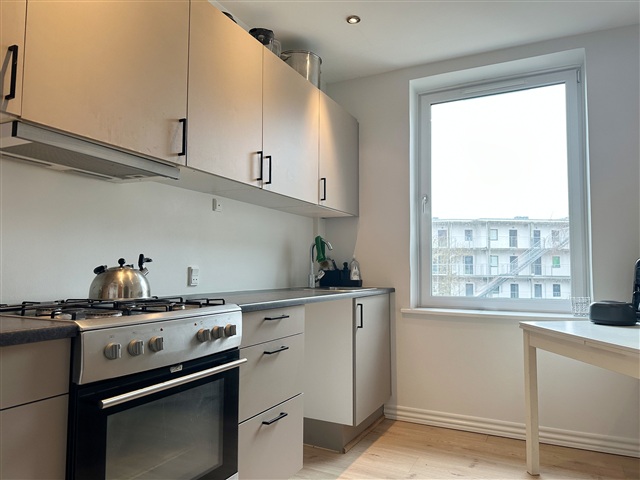This well-laid-out and charming apartment on Signalvej offers a spacious living environment characterized by elegant, classic features and abundant natural light streaming through large windows. The residence features a practical layout that includes a generous, bright living room, two regular-sized bedrooms, and a separate kitchen area.The living room showcases beautiful plank flooring, decorative molding, and expansive window sections that create a welcoming ambiance with ample room to accommodate both seating and dining arrangements. The kitchen is designed to be bright and efficient, providing plenty of cabinet and counter space, and a dishwasher will be installed as part of the amenities. The bathroom is thoughtfully arranged with a separate shower enclosure, ensuring functionality.
