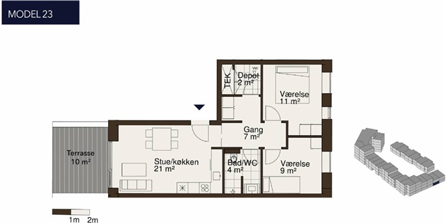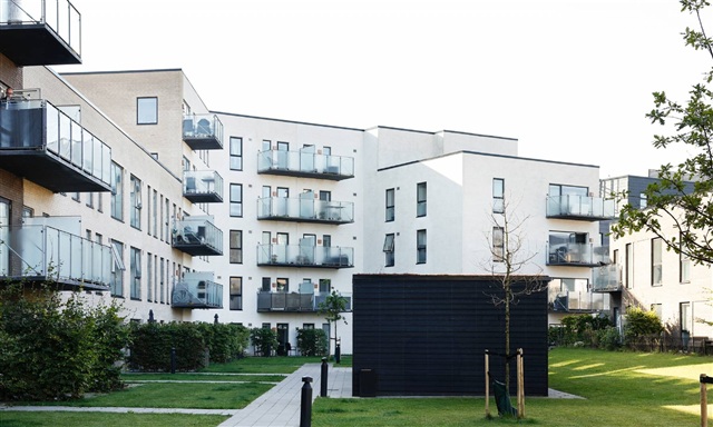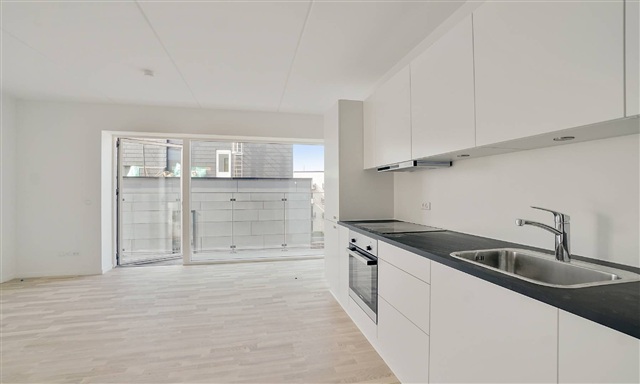 Situated within one of the architecturally distinctive buildings in Egedal's new district, the property offers proximity to urban conveniences while being nestled amidst natural surroundings. The buildings are surrounded by pleasant green lawns, and there is a covered bicycle parking area available.