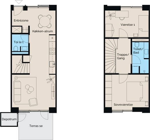This two-story townhouse spans 85 square meters and offers a practical layout enhanced by underfloor heating throughout. On the ground floor, the entrance area leads to an elegant bathroom and a bright kitchen-dining space that flows seamlessly into the living room. The contemporary Svanekitchen boasts high-quality white cabinetry, a dark countertop, a built-in oven set at a convenient height, and an induction cooktop. From the living area, there is direct access to a private terrace facing south-west, allowing for afternoon and evening sunlight enjoyment. Upstairs features a landing, two spacious bedrooms, a master bedroom with a French balcony, and a stylish bathroom equipped with a laundry column. This residence is well-suited for those seeking comfort, practicality, and privacy within a modern environment.