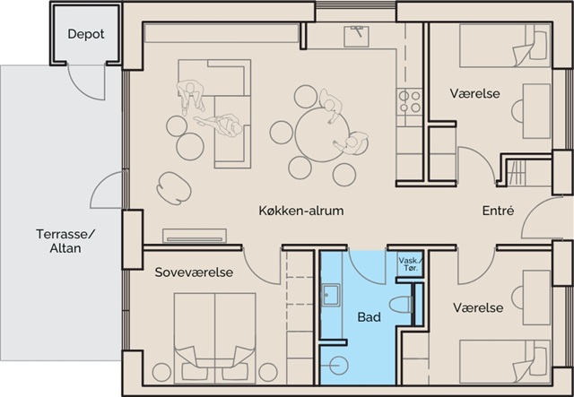 This spacious and practical four-room apartment offers ample room suitable for both family living and social gatherings. Upon entering, you will find built-in wardrobe space in the entrance area. From the kitchen-living room combination, there is access to three separate bedrooms, each providing versatile options for furnishing. The high-quality Svanekitchen features white cabinetry, a dark countertop, an elevated oven, and an induction cooktop. It seamlessly connects to the living area, which comfortably accommodates both a dining table and a seating section. Extensive floor-to-ceiling windows flood the space with natural light. The bathroom is designed in a modern style, spacious enough to include a laundry column, and underfloor heating is installed throughout the apartment, with controls available for individual rooms. The ground floor units benefit from a private terrace, whereas those on the first floor and in the penthouse feature balconies facing south-west, allowing for sun exposure well into the evening hours.