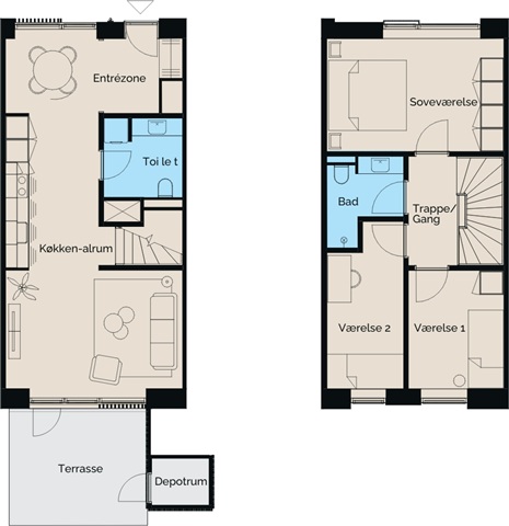 This terraced house, spanning 95 square meters over two levels, is thoughtfully designed to accommodate a family comfortably. On the ground floor, you will find an entrance hall, a modern guest toilet, and a spacious kitchen-dining area that flows openly into the living room. The high-quality Svane kitchen features white cabinetry, a dark countertop, an oven positioned at eye level, and an induction cooktop. From the living room, direct access leads you to a terrace facing south-west, perfect for enjoying sunlight well into the evening hours. Upstairs, the landing connects to the master bedroom, which includes a French balcony, two additional well-sized bedrooms, and the main bathroom. Throughout the residence, underfloor heating with individual controls ensures modern convenience, blending contemporary comfort with a warm and inviting atmosphere.
