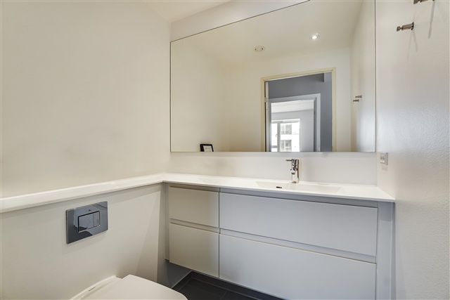 The kitchen is generously sized and designed with light-toned Invita cabinetry, showcasing a sleek and timeless aesthetic complemented by a full set of integrated appliances. The bathroom continues this cohesive design approach by incorporating Invita elements, establishing a consistent style throughout the entire apartment.