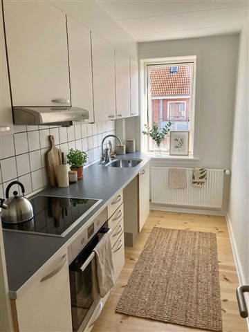 Located in a peaceful yet centrally positioned neighborhood in Aalborg, this property offers quick access to everyday shopping as well as a brief bike ride to the city center. The building itself is well maintained, featuring lush communal green spaces alongside practical basement facilities.This ready-to-move-in apartment comprises three rooms spread across 92 square meters, benefiting from abundant natural light throughout. The spacious living room opens directly onto a private balcony, providing an inviting outdoor space. The kitchen is designed with timeless style and optimized for functionality. The bathroom includes a separate shower area and has space allocated for a washing column. Adjacent to the entrance hall, there is a closed walk-in storage room or utility room, visible in the accompanying photos. Additionally, the tenant has access to a private storage unit located in the basement. Secure bike and stroller storage rooms are available, enhancing convenience and security. The property's well-kept green communal areas contribute to a pleasant environment.