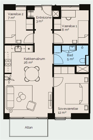 This spacious and practical four-room apartment offers ample room, ideal for both family life and social gatherings. The entrance area includes built-in wardrobe space, and from the kitchen-dining room, you can access three bedrooms, each providing versatile options for furnishing. The high-quality Svanekitchen features white cabinetry, a dark countertop, a raised oven, and an induction cooktop, seamlessly connected to the dining and living area, which comfortably accommodates both a dining space and a lounge. Floor-to-ceiling windows flood the space with natural light. The bathroom is modern and designed to accommodate a washing column, while underfloor heating is installed throughout the apartment, with individual controls for each room. Apartments on the ground floor benefit from a private terrace, whereas first-floor and penthouse units feature balconies facing south-west, allowing for extended evening sunlight.