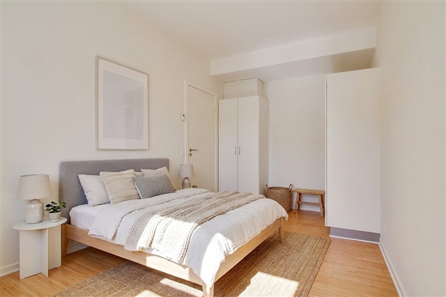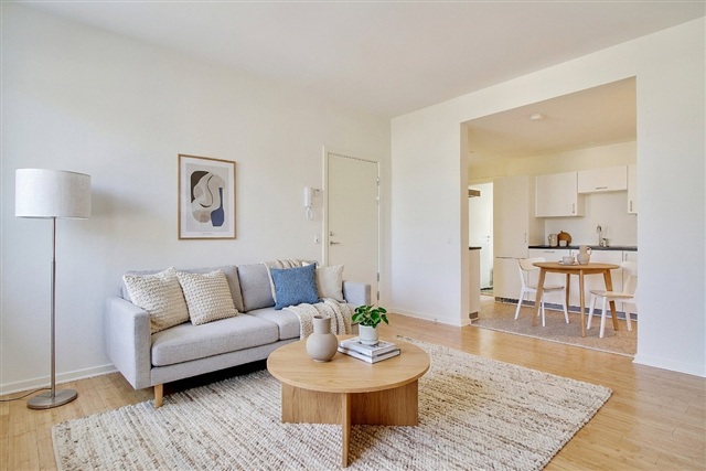 This well-designed apartment offers a harmonious blend of natural light, calming materials, and an efficient layout. Situated within a traditional building characterized by a red tiled roof and a smooth plastered facade, the residence features a bright living area, two generously sized bedrooms, and a bathroom-an everyday setting well-suited for couples or small families.Upon entering, you are greeted by the living room, where light wooden floors contribute to a welcoming ambiance. The living area seamlessly connects to the kitchen through a wide opening, creating a clear yet natural division between the cooking and relaxation spaces. The kitchen is furnished with white cabinetry, complemented by a dark countertop, providing ample storage and workspace.