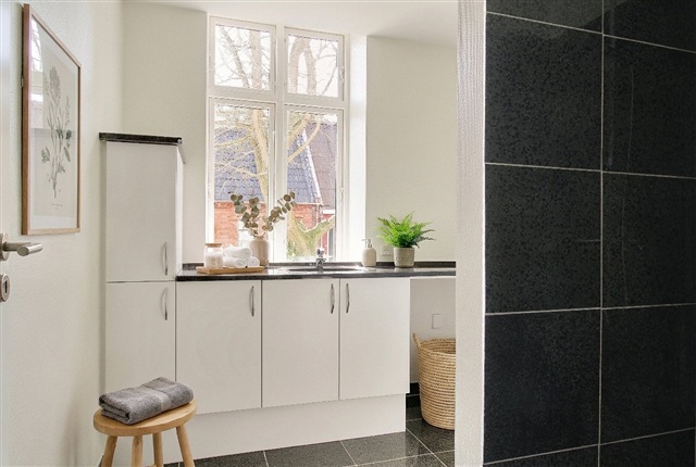 The bathroom is thoughtfully laid out, featuring a separate shower area with dark tiles and a large countertop with storage underneath. A window allows for daylight and ventilation, and the inclusion of a washing machine adds to everyday convenience.