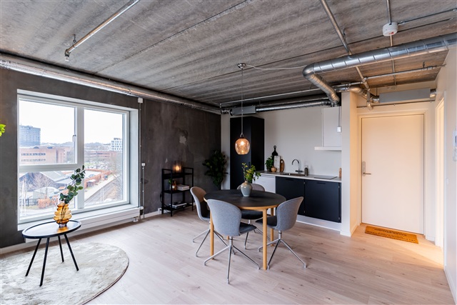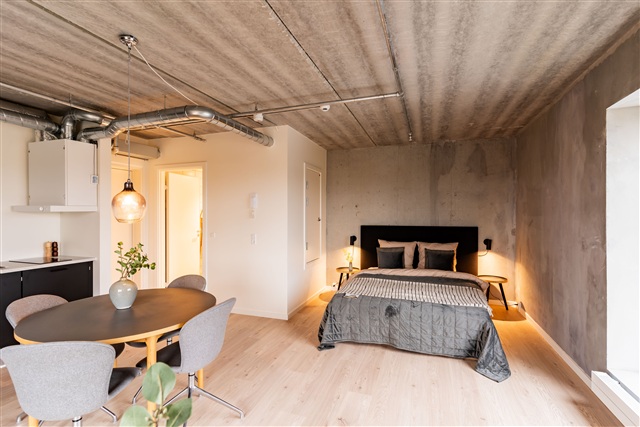 This spacious and contemporary dormitory room features distinct raw concrete walls, lending it a unique character. The room offers ample space to accommodate a dining area, a double bed, as well as a sofa. It includes a modern kitchen equipped with a refrigerator, cooking hob, and extractor fan. The bathroom is bright and well-designed, fitted with a shower enclosure.On each floor, residents have access to a large communal kitchen where meals can be enjoyed alongside other tenants or visiting family members. Additional shared facilities include a laundry room, bicycle storage, and extra storage options. The apartment is situated in the attractive area of Lyngby, within close proximity to Lyngby Torv, which offers cafés, shopping opportunities, and charming streets. Lyngby Station is easily reachable on foot or by bike, providing frequent departures to Copenhagen Central Station.