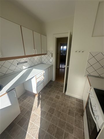 The apartment is characterized by its bright and welcoming atmosphere, featuring elegant plank flooring and expansive windows that allow ample natural light to fill the rooms. Its layout is both practical and spacious, offering generously sized rooms that provide versatile options for furnishing and use.The kitchen is designed with functionality in mind, equipped with plenty of cupboards and counter space to accommodate everyday cooking needs. It presents a light and classic appearance, enhancing the overall ambiance of the home.