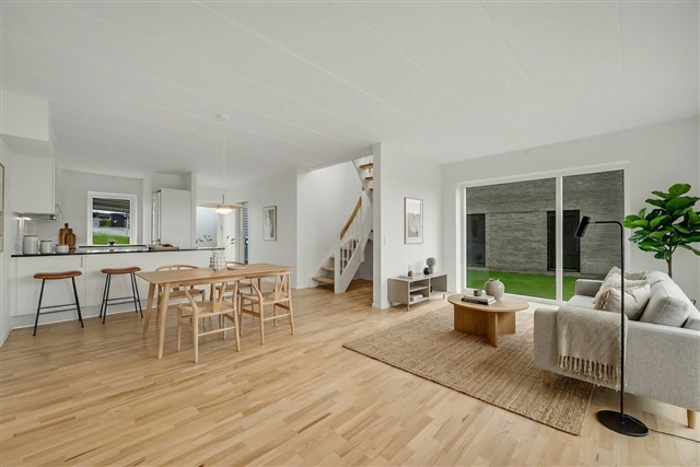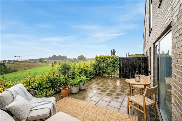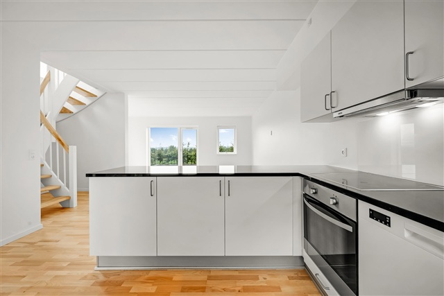 The heart of the home lies in the generous, open-plan kitchen, dining, and living space. The kitchen itself is sleek and timeless, featuring white cabinetry paired with black countertops, an integrated dishwasher, a built-in oven, an extractor hood, and plenty of cabinet and workspace. A convenient peninsula with room for bar stools adds to the functionality. The living and dining areas can be arranged effortlessly with dining furniture and a sofa set, while large windows flood the space with natural light. From here, direct access leads to a spacious tiled terrace offering unobstructed views of surrounding green spaces-creating a private outdoor area that accommodates lounge furniture and a grill while remaining easy to maintain.