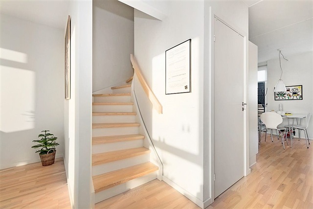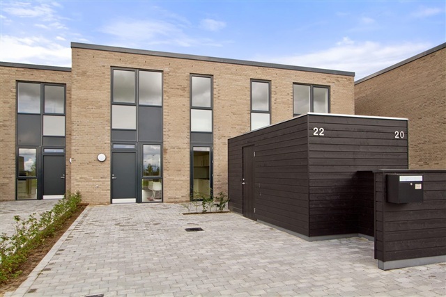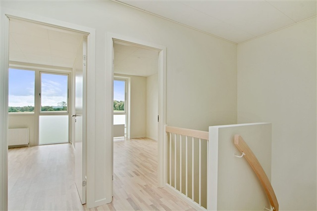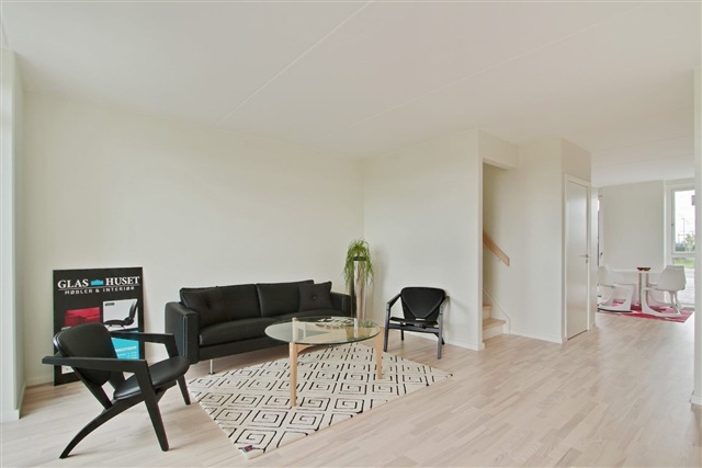 This charming townhouse features a small private garden facing south and a cozy terrace nook oriented towards the north-east. Situated close to the town center and near Herning Golf Course, the location offers convenient access to good shopping options just steps from the doorstep. The house spans two floors and on the ground level includes a bright, modern kitchen equipped with a dishwasher and ample dining space, leading out to a small, inviting sitting area. The living room is characterized by large windows and provides direct access to the garden, which includes a paved terrace.Inside, the home offers two pleasant bathrooms with showers, one located on the first floor and also furnished with a washing machine and dryer. Below the staircase to the first floor, a spacious storage room is available. Upstairs are a large master bedroom along with two additional well-sized rooms. Skylights on the upper floor ensure the rooms benefit from abundant natural light.