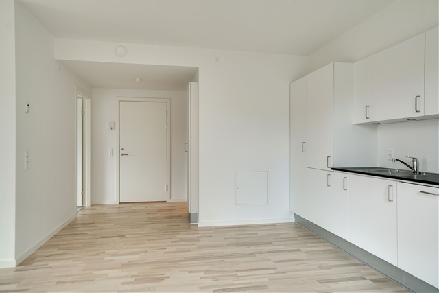 This contemporary and stylish apartment is located in the heart of Valby. Situated in a newly constructed building, the residence offers a well-thought-out layout and high-quality finishes, making it an ideal choice for couples or small families. The striking exterior features a brick facade complemented by metal panels on the top floor, lending the structure an edgy, modern character. Outside, large windows and balconies disrupt the uniformity of the facade, adding visual interest.Upon entering, the hallway connects openly with the rest of the home and includes a built-in wardrobe providing ample space for outerwear. The bathroom is equipped with a shower enclosure and has room to accommodate a compact laundry column. The bedroom stands out due to its generous dimensions and exceptional natural light. Most of the apartment's square footage is dedicated to the living area, where a bright, modern design is emphasized by beautiful flooring and expansive window sections. The kitchen is laid out efficiently along one wall, creating an open living space that offers many possibilities for furnishing and decoration. The living room is particularly inviting, featuring access to a practical storage room, broad windows, and a patio door leading to the south-facing balcony, which overlooks the neighborhood.