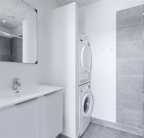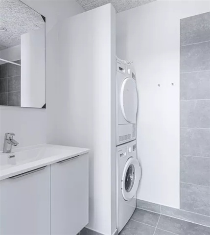 This home is accompanied by two practical bathrooms, each equipped with a shower, toilet, and a sink featuring storage underneath. The bathroom on the ground floor additionally contains a laundry column with both a washing machine and a dryer.