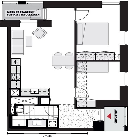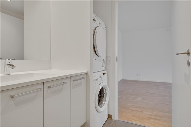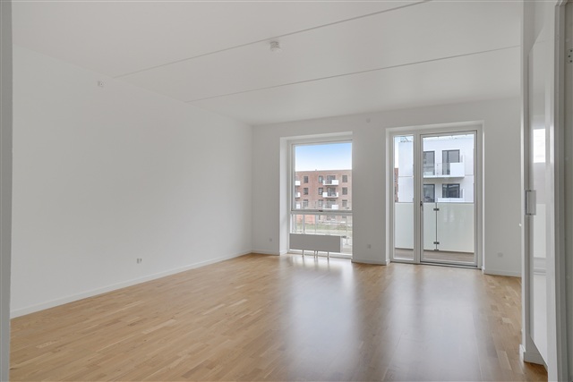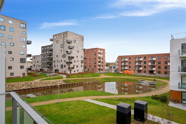 Throughout all residences in ERDAHUS, a bright and Nordic architectural style is evident. The rooms exude a natural ambiance, enhanced by classic oak parquet flooring, while large window sections guarantee ample natural light. A ventilation system with heat recovery is installed to maintain a healthy and comfortable indoor environment. Kitchens and bathrooms feature sleek elements designed by Invita, complemented by Siemens appliances. The bathroom is outfitted with underfloor heating and low-maintenance tiles, containing a toilet, washbasin, shower stall, and a laundry column. The building extends around a verdant communal area, with spacious balconies facing the courtyard. At the top floors, the structure slopes downward, offering apartments with expansive private roof terraces. This particular apartment is situated on the second floor.Public transportation options to Aarhus city center and educational institutions are excellent, providing convenient commuting possibilities. For those who prefer cycling, a pleasant eight-minute ride brings you into central Aarhus. Small pets are permitted within the residence. Additionally, there is an option to rent a parking space in the underground garage.