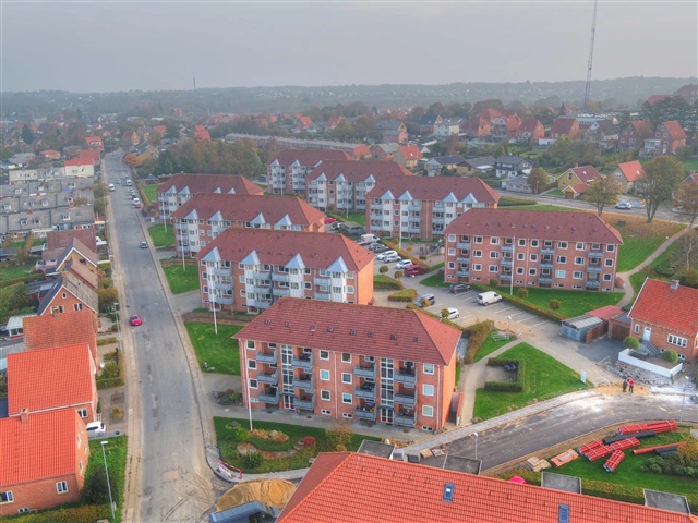 Ringparken is situated in the western part of the city, offering convenient access to the city's ring roads and lying close to shopping facilities as well as the center of Skive.The housing complex comprises 10 residential blocks, each with three floors, originally built in the 1940s. Over the years, they have undergone continuous renovations, the most recent being in 2006 and 2007 when new kitchens and bathrooms were installed. Every apartment features a large open balcony, while units located in Ringparken 5 through 10 also benefit from an enclosed balcony. In the basement, residents have access to drying rooms, bicycle storage, and their own individual storage rooms.