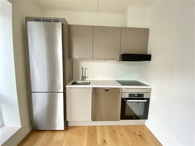 This charming one-room apartment, measuring 37 m², is available for rent within the rapidly evolving Munkebjerg Park district, specifically situated in the section of the building known as M-Tower. Upon entering the building, you walk straight into the apartment, where a spacious, bright living area awaits, featuring built-in closets and access to a beautifully tiled bathroom. The bathroom includes a shower cubicle, wall-mounted Grohe toilet, a stylish illuminated mirror, and a sink with cabinetry from Duravit. Underfloor heating is installed throughout, and tucked into the corner of the bathroom is a high-quality Sonos speaker. Additionally, a washing machine and tumble dryer by Miele are provided.The layout efficiently utilizes the available space, with the kitchen positioned in a corner of the living room, allowing for a comfortable dining area. The kitchen itself is crafted by Designa in a matte gray finish, topped with an elegant Corian countertop. All integrated appliances are from Miele, ensuring both functionality and style. Large window sections allow ample natural light to flood the entire apartment, which also opens out onto a terrace.