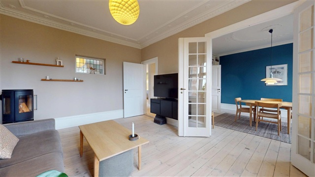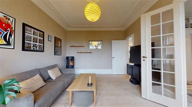 Situated on one of the most sought-after streets in Frederiksberg, this spacious and elegant apartment of 107 m² is now available for rent. Located on Jacoby Allé, the residence is presented in excellent condition and features numerous refined details that contribute to its sophisticated ambiance. The layout includes a large, bright open kitchen, a bedroom, and two charming en suite living rooms, offering a generous sense of space and flexible furnishing options.Abundant natural light fills the home through expansive windows, highlighting the beautiful flooring and classic architectural features such as decorative mouldings, attractive panels, and other traditional elements that add character and warmth. Additionally, the apartment is equipped with a cozy wood-burning stove, enhancing the inviting atmosphere. There is also a pleasant, sunny balcony that overlooks a park-like courtyard, providing a tranquil outdoor retreat.