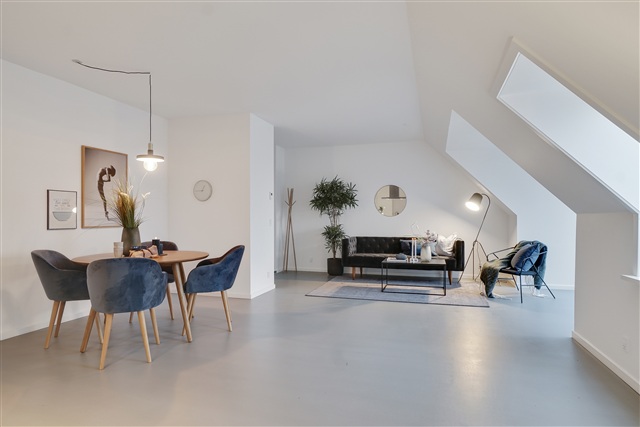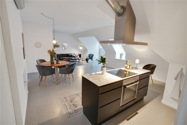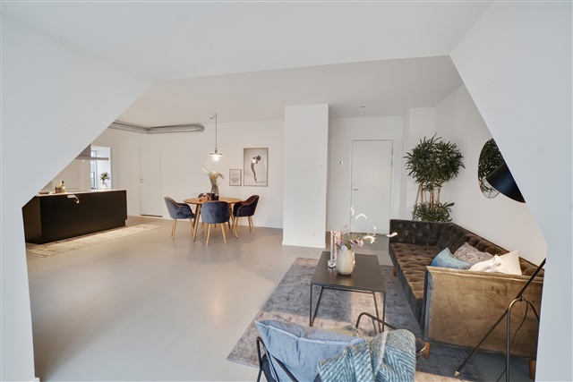 This well-maintained apartment is situated in the heart of Copenhagen, featuring a distinctive industrial New York-style design highlighted by poured concrete floors and underfloor heating throughout the entire unit.The open-plan kitchen and living area offers a spacious environment that invites personalization, with the kitchen seamlessly integrated as a central gathering place within the home. The bathroom is designed with a contemporary touch, showcasing ample countertop space around the sink, a glass shower enclosure, and a stacked washer and dryer unit for convenience.