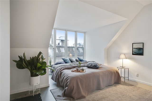 Despite the slanted walls in the bedroom, the room remains bright and roomy, providing practical options for storage solutions. The building itself is located in central Copenhagen, where shopping and daily errands are easily handled, notably with a Netto supermarket situated directly opposite the property. Just a short walk away lies Kultorvet on Landemærket, known for its sidewalk cafés and charming fruit and flower stalls that contribute to a cozy atmosphere.